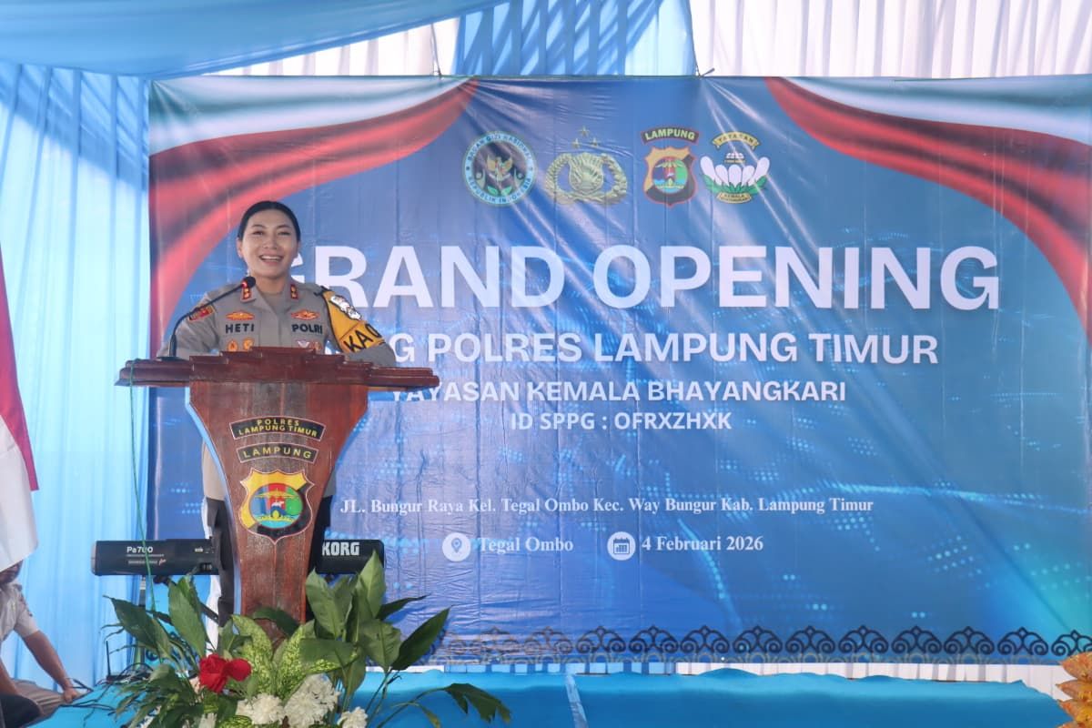 LAMPUNG TIMUR - Kapolres Lampung Timur AKBP Heti Patmawati secara resmi melakukan grand opening Satuan Pelayanan Pemenuhan Gizi (SPPG) Polres Lampung Timur yang berlokasi di Desa Tegal Ombo, Kecamatan Way Bungur, Kabupaten Lampung Timur. Kegiatan ini menjadi langkah nyata Polres Lampung Timur dalam mendukung peningkatan kualitas gizi masyarakat, khususnya bagi anak-anak dan kelompok rentan.